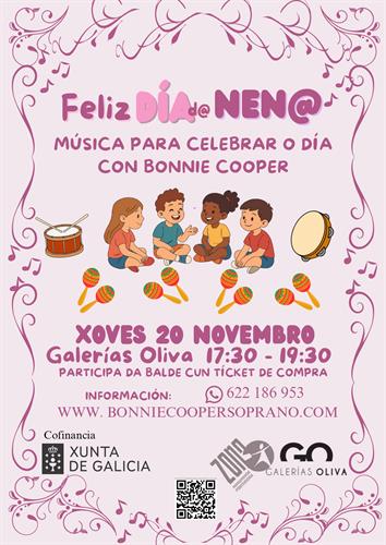 O 20 de novembro, disfruta dunha tarde de obradoiros musicais dirixidos pola soprano Bonnie Cooper para nenos e nenas de 0 a 8 anos.